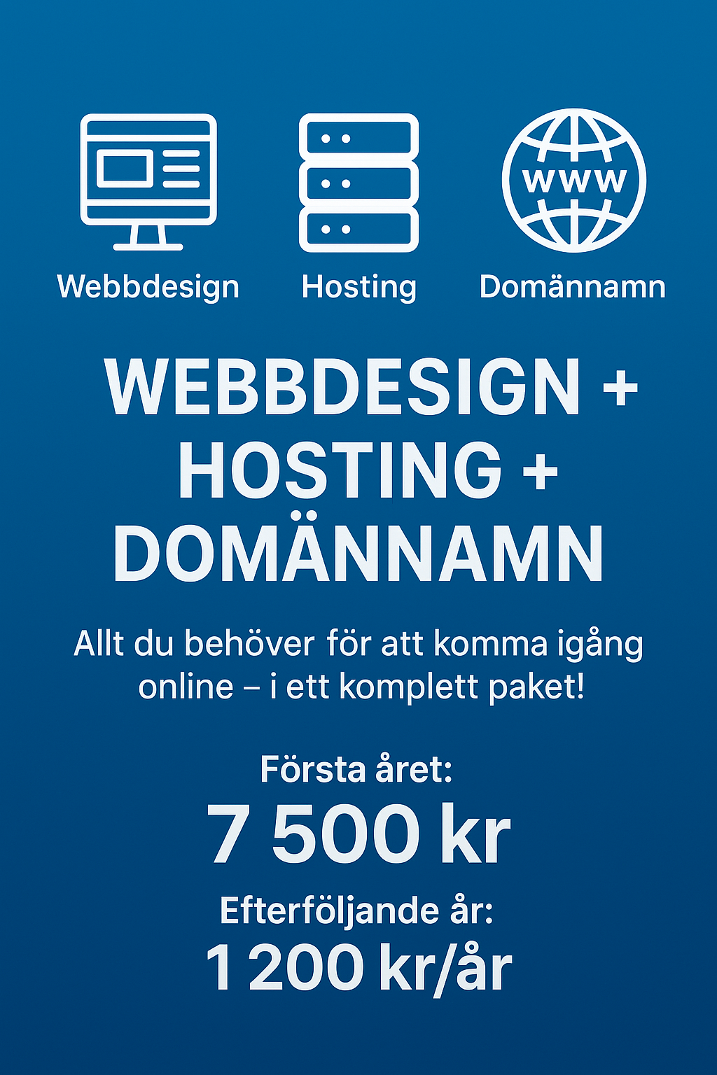 Med vårt helhetslösning får du allt du behöver: en snygg och funktionell hemsida, snabb och säker hosting samt ett eget domännamn. Perfekt för småföretag, entreprenörer och kreatörer som vill komma igång utan krångel.